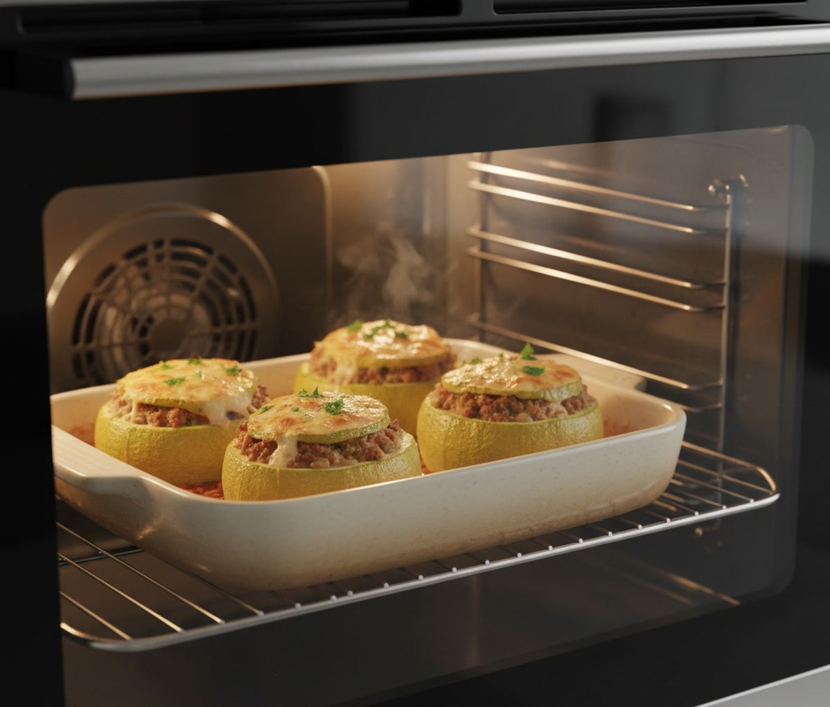Préchauffer le four à 180°C en mode chaleur tournante pour une cuisson régulière. Disposer les courgettes dans un plat allant au four, légèrement huilé pour éviter que ça colle. Remplir généreusement chaque cavité avec la farce, en tassant légèrement mais sans forcer. Remettre les chapeaux sur les courgettes pour emprisonner les saveurs. Arroser d’un filet d’huile d’olive et saupoudrer de chapelure pour une croûte dorée. Enfourner au milieu du four pour 25 à 30 minutes. Les courgettes doivent être tendres au toucher d’une fourchette, et la surface légèrement croustillante. Sortir le plat et laisser reposer 5 minutes avant de servir. Cette pause permet aux jus de se répartir.
